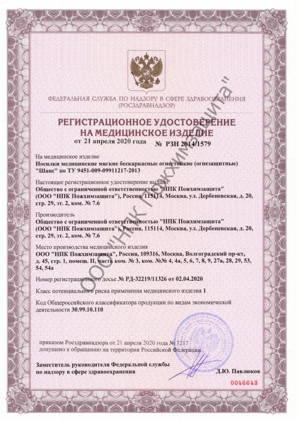 Медицинские носилки «Шанс» с функцией защиты от огня полностью соответствуют действующим регламентам в сфере пожарной безопасности и медицинского назначения.